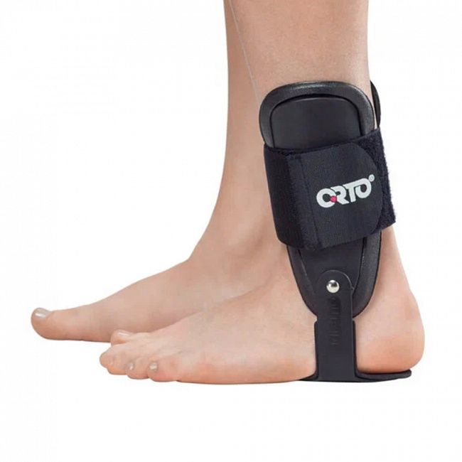 Шарнирный ортез на голеностопный сустав с амортизирующими накладками на голень. Основа разъемная, состоит из двух частей, соединённых с ложементом стопы. Шарниры одноосные и расположены в проекции голеностопного сустава. Фиксация ортеза на ноге осуществляется за счёт широкого ремня с застежкой «Велкро». Накладки и ремень съемные. Основной материал ортеза – пластик, накладок – EVA (этиленвинилацетат).